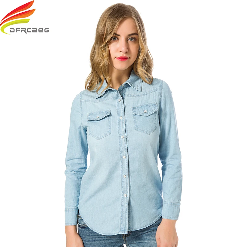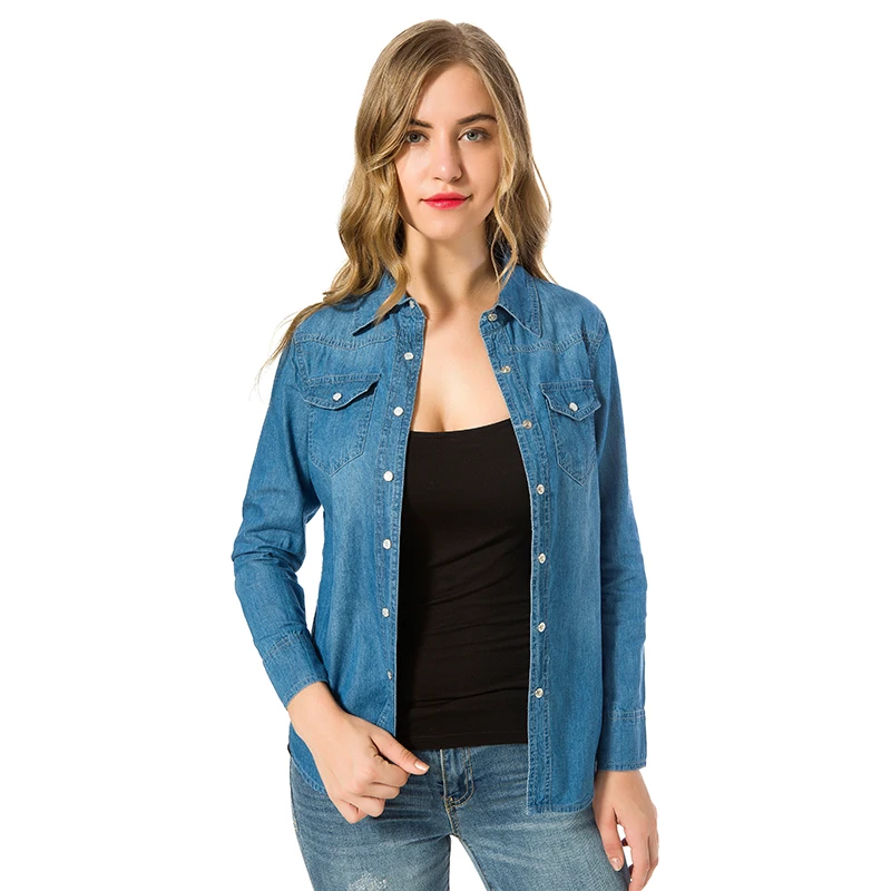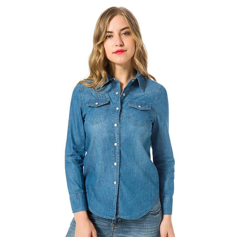 New Denim Shirt Women Autumn 2019 Blue And Sky Blue Clothes Plus Size Shirt With Double Pockets Long Sl