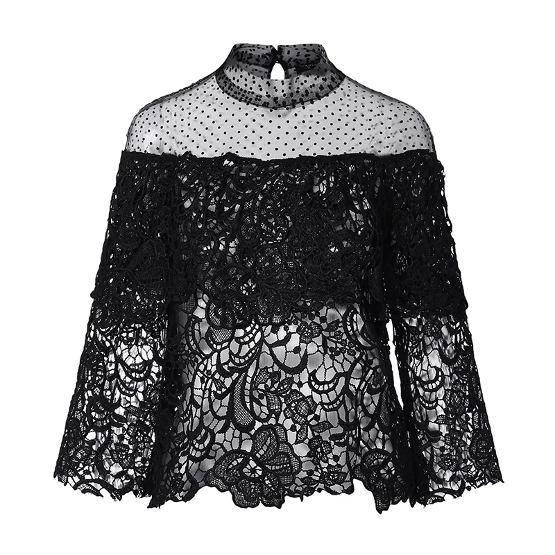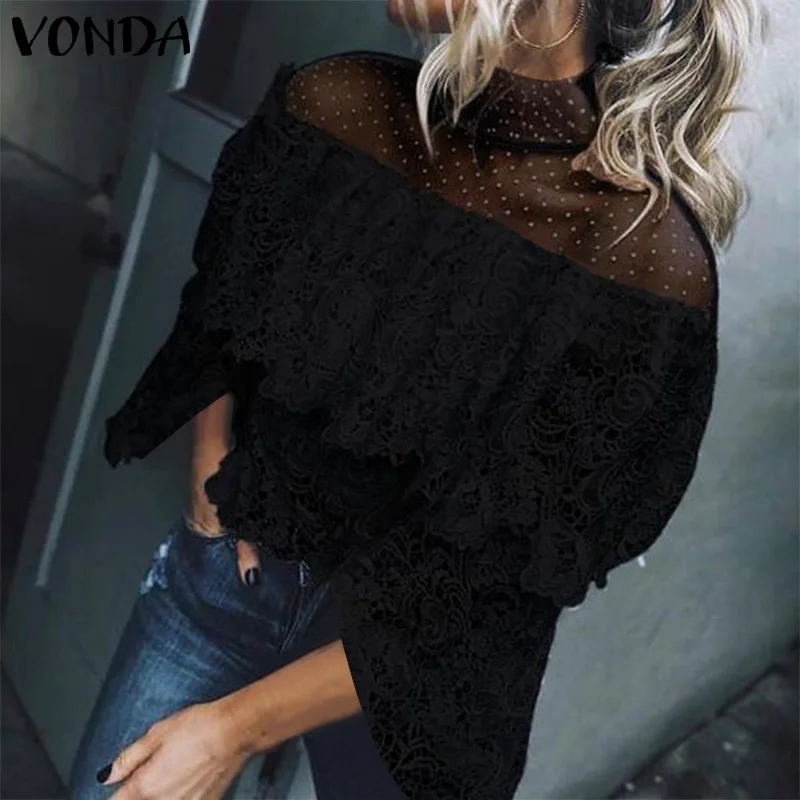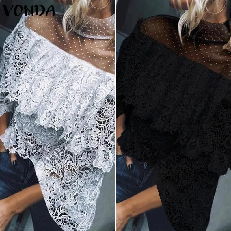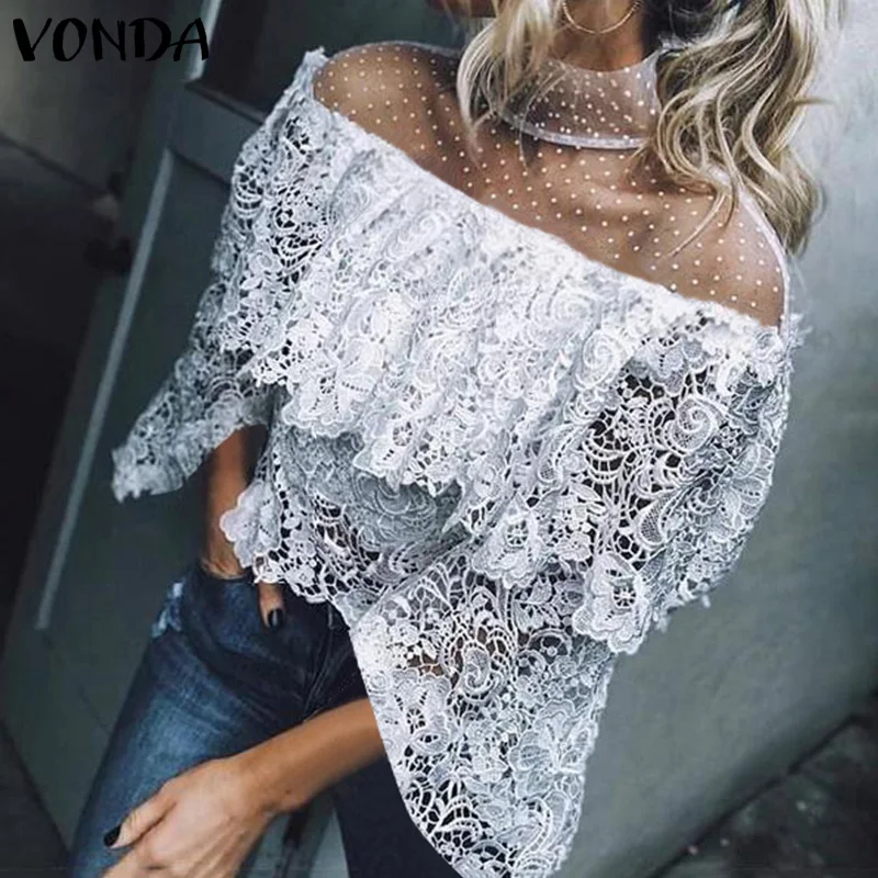 Promo VONDA 2019 Fashion Tops for Women Summer Lace Blouse Shirt Female Crochet Off Shoulder Shirt Casual